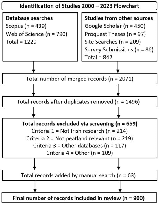 The Web of Science and Scopus databases were searched on 10 October 2023 using the keyword search string “(irish OR ireland) AND (peatland OR bog OR fen OR mire OR bogland)”. This search string was the most appropriate fit for the study scope and aims. Different phrases and keyword strings were tested using Boolean searching (AND, OR, NOT) and the addition of various terms (e.g., biodiversity, restoration, just transition) to the core search string, e.g., (irish OR ireland) AND (peatland* OR bog OR fen OR mire OR bogland) AND (biodiversity). However, these variations yielded no additional value in the results. Results from these databases were combined, as Web of Science generally covers natural sciences and engineering, while Scopus includes the social sciences to a greater degree, so combining these data sources improved the quality and scope of the results [20]. A summary of the keyword search strategy for each database is provided in Table 1.