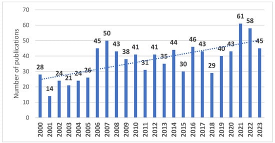 Number of publications by year of publication (from January 2000 to end of October 2023).