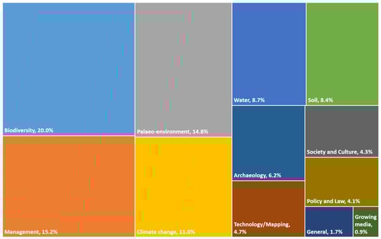The thematic distribution of the research provides an indicative overview of the concentration of the academic focus, highlighting areas where knowledge gaps persist (Figure 5). Publications related to biodiversity, management, paleo-environment, climate, water, and soil were most prevalent (78% of the database). A total of 180 papers were catalogued for the biodiversity category, making it the largest (approximately 20.1%) in the database. Research on the cultural, societal, policy, and legal dimensions of peatland conservation, restoration and management was less well established (8.8%). Archaeology constituted a relatively minor proportion of the overall research (6.2% of the studies reviewed), while new technology and mapping of peatlands is growing rapidly (4.7%). Finally, research on growing media was the most limited (0.9%).