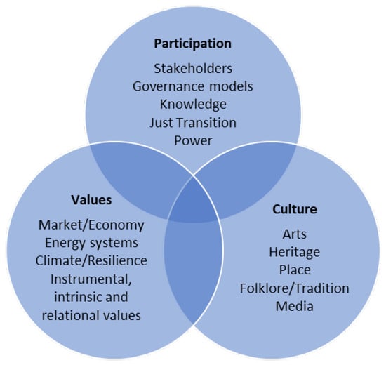 Research in this category is grouped into the thematic areas: participation, values, and culture, which intersect and connect to each other across multiple dimensions (Figure 6). These intersections include the ways in which individual and shared values shape culture, how culture influences the levels of, and capacity for, participation, and how meaningful participation enables people to express their values. Power dynamics can also be observed across these themes, in terms of who defines values, whose culture is recognised, and who gets to participate and how, with the evidence base demonstrating the complexity of the human and socio-cultural dimensions of sustainable peatland management [3,4,60]. This complexity underscores the need for integrated rather than single-value (GHG emissions) approaches to peatland management, monitoring, and ecosystem services assessment, so as to combine ecological, socio-cultural, economic, and ethical value dimensions [6,7,61].