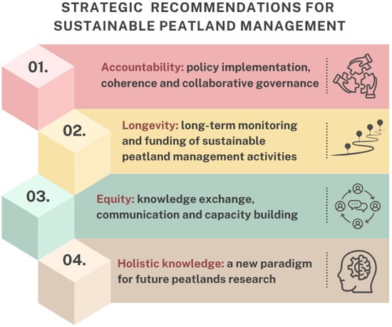 Sustainability is a well-established goal in global and national governance and a key concept in peatland management, given the need to sustain the diverse range of ecological, social, and economic values associated with peatlands [4]. Current scientific knowledge shows that peatlands provide multiple social-ecological benefits beyond traditional uses, such as fuel or horticulture [4]. Yet, improving sustainability across all the ecosystem services provided by peatlands has presented significant challenges to date. In this review, sustainable peatland management (SPM) is defined as societal responsibility to optimise the social, cultural, environmental, and economic contributions that peatlands make to the health and well-being of current and future generations. The sustainable management of ecosystems, such as peatlands, requires navigating uncertainty and balancing the diverse perspectives and values of multiple stakeholders, as well as considering nonhuman communities [5]. Research has shown the negative impact that degraded peatlands have on water quality, air quality, flora and fauna, flood risk, and climate (through greenhouse gas (GHG) emissions), as well as the impacts on cultural heritage and the communities that live and work in these landscapes [6]. Despite the recognition of restored peatlands as valuable ecosystems that play a crucial role in supporting human health and well-being, implementation of policy often lags behind the evidence [7].