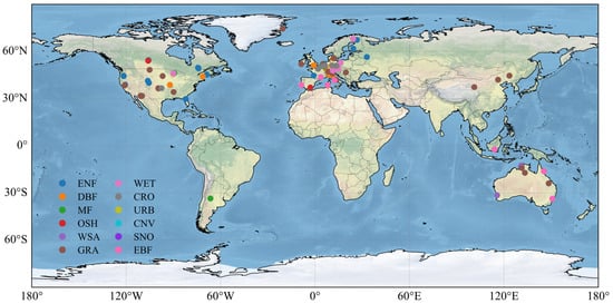 This study analyzes data from 105 global sites, encompassing 12 different vegetation types classified according to the International Geosphere–Biosphere Programme (IGBP) [28], including evergreen needleleaf forest (ENF), evergreen broadleaf forest (EBF), deciduous needleleaf forest (DNF), deciduous broadleaf forest (DBF), mixed forest (MF), closed shrublands (CSH), open shrublands (OSH), woody savannas (WSA), savannas (SAV), grasslands (GRA), permanent wetlands (WET), and croplands (CRO). The selection of these 105 sites was based on data availability and the aim to cover a wide range of IGBP vegetation types from the high-quality FLUXNET2015 dataset. Specifically, sites were chosen if they provided continuous, multi-year records of both the required meteorological forcing data and the target flux variables (ET and GPP) necessary for a robust evaluation. The site information is provided in Table S1. The geographical distribution of these sites, classified by IGBP type, is shown in Figure 1. Sites are primarily concentrated in Western Europe and North America, with fewer sites in China and Australia.