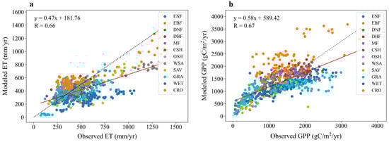 Comparison of modeled versus observed annual mean for (a) evapotranspiration (ET) and (b) gross primary productivity (GPP) fluxes across 12 vegetation types. Dashed lines indicate a 1:1 relationship, and solid lines show linear regression fits, with correlation coefficients (R) displayed.