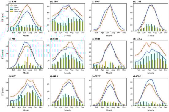 Multiyear averaged seasonal variations (solid lines) in the simulated and observed ET flux across 12 vegetation types and the corresponding standard deviation (bar charts) across sites: (a) ENF: evergreen needleleaf forest; (b) EBF: evergreen broadleaf forest; (c) DNF: deciduous needleleaf forest; (d) DBF: deciduous broadleaf forest; (e) MF: mixed forest; (f) CSH: closed shrublands; (g) OSH: open shrublands; (h) WSA: woody savanna; (i) SAV: savanna; (j) GRA: grasslands; (k) WET: wetlands; (l) CRO: croplands.