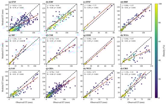 Performance varies significantly across vegetation types. CSH shows the best performance with a high correlation (R = 0.93, p < 0.001) and low relative error (6.02%), indicating excellent agreement. DNF performs the worst, with a negative correlation (R = −0.37, p = 0.7555, not significant), significant overestimation (observed 302.13 mm yr−1 vs. simulated 396.04 mm yr−1, relative error 31.08%), and high variability. The lack of significance for OSH (p = 0.545) and DNF might be due to small sample sizes. For most other types (DBF, CSH, WSA, SAV, GRA, WET, CRO), the p-values are <0.001, indicating statistically significant confidence levels.