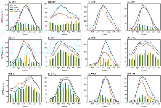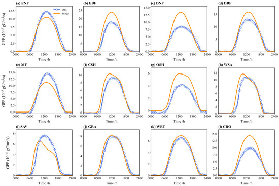 Comparison between the observed and simulated GPP flux on a diurnal course in different vegetation types (multi-year average): (a) ENF; (b) EBF; (c) DNF; (d) DBF; (e) MF; (f) CSH; (g) OSH; (h) WSA; (i) SAV; (j) GRA; (k) WET; (l) CRO.