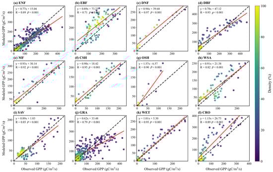Scatter plots of monthly GPP flux between simulation and observation for sites in different vegetation types: (a) ENF; (b) EBF; (c) DNF; (d) DBF; (e) MF; (f) CSH; (g) OSH; (h) WSA; (i) SAV; (j) GRA; (k) WET; (l) CRO. Dashed lines indicate a 1:1 relationship, and solid lines show linear regression fits, with correlation coefficients (R) displayed.