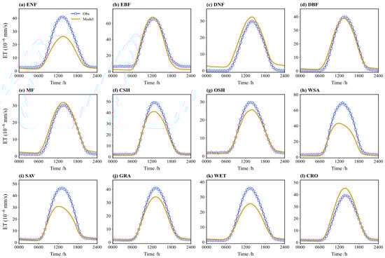 Comparison between the observed and simulated ET flux on a diurnal course in different vegetation types (multi-year average): (a) ENF; (b) EBF; (c) DNF; (d) DBF; (e) MF; (f) CSH; (g) OSH; (h) WSA; (i) SAV; (j) GRA; (k) WET; (l) CRO.