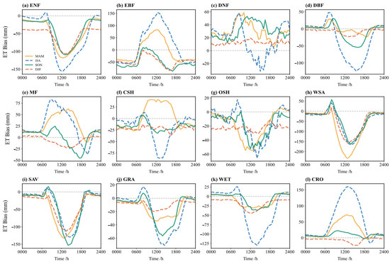 Bias (simulation minus observation) of the multi-year average diurnal variation of ET flux in different vegetation types in spring, summer, autumn, and winter: (a) ENF; (b) EBF; (c) DNF; (d) DBF; (e) MF; (f) CSH; (g) OSH; (h) WSA; (i) SAV; (j) GRA; (k) WET; (l) CRO.