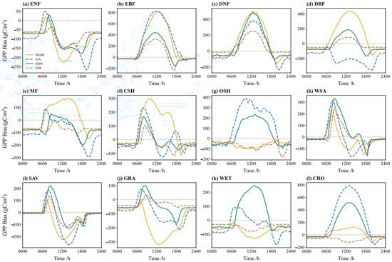 Bias (simulation minus observation) of the multi-year average diurnal variation of GPP flux in different vegetation types in spring (yellow), summer (blue), autumn (green), and winter (red): (a) ENF; (b) EBF; (c) DNF; (d) DBF; (e) MF; (f) CSH; (g) OSH; (h) WSA; (i) SAV; (j) GRA; (k) WET; (l) CRO.