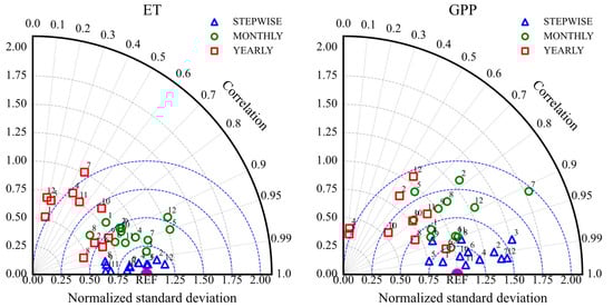 Taylor diagram showing the comparison of simulation performance for ET and GPP at half-hourly, monthly, and annual temporal scales for different vegetation types (1: ENF; 2: EBF; 3: DNF; 4: DBF; 5: MF; 6: CSH; 7: OSH; 8: WSA; 9: SAV; 10: GRA; 11: WET; 12: CRO).