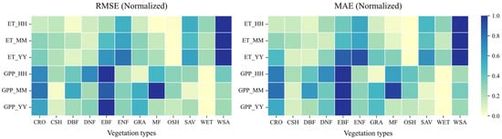 Model performance in simulating ET and GPP on temporal scales of half-hourly (HH), monthly (MM), and annual (YY) measured using the RMSE and MAE for different vegetation types.