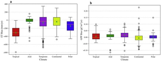 Distribution of annual simulation biases for (a) evapotranspiration (ET) and (b) gross primary productivity (GPP) across five principal climate zones. The bias is calculated as the simulated value minus the observed value. In the box plot, the central horizontal line indicates the median, while the bottom and top edges of the box represent the 25th (Q1) and 75th (Q3) percentiles, respectively. The whiskers extend to the most extreme data points within 1.5 × IQR (where IQR = Q3 − Q1) of the box. The triangle symbol (△) indicates the mean value. Individual points beyond the whiskers are marked as outliers.