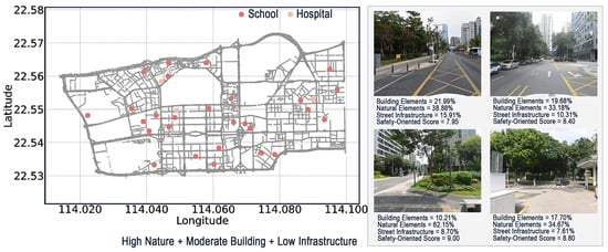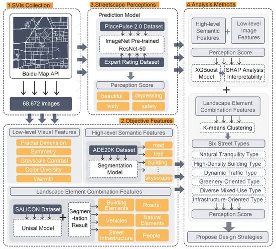 With the accelerating pace of global urbanization, enhancing the quality of the urban environment is not only essential for improving city competitiveness but also directly impacts residents’ daily experiences and overall well-being [1,2]. As the direct medium through which people experience urban space, streetscapes play a central role in shaping environmental quality [3]. Among various factors, visual perception serves as a primary channel through which people understand and evaluate streetscape environments [4]. Visual features presented in streetscapes, such as colors and natural elements, significantly influence people’s subjective feelings toward the environment [5,6], which in turn affect behavioral patterns such as cycling intention [7], walking activity [8], and running frequency [9].