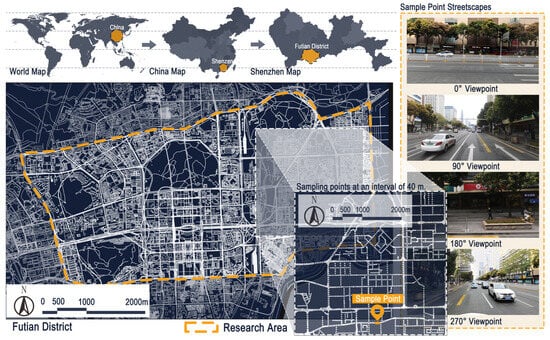 This study selected the central district of Futian in Shenzhen, China, as the research area (Figure 2), bounded by Beihuan Avenue to the north, Xiangmihu Road to the east, Binhe Avenue to the south, and Hongling Middle Road to the west. This area represents a dense urban core characterized by intense population mobility and diverse urban functions, providing a representative sample for urban streetscape optimization and functional enhancement research.