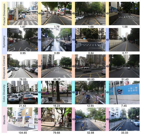 In addition to the influence of semantically segmented high-level features on landscape perceptions, previous studies have demonstrated that LLVFs in streetscapes also play a crucial role in shaping perceptual experience. This study selected five representative LLVFs: fractal dimension, symmetry, grayscale contrast, color diversity, and warmth (warm–cool tendency). The selection rationale is as follows: