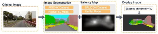 Landscape element combination features reflect the distribution patterns of various visual elements in SVIs. However, studies have shown that human visual attention is not evenly distributed [50], but instead highly concentrated in specific “salient regions” of an image. Therefore, directly extracting combination features from the entire image may introduce a large amount of irrelevant or low-impact information, such as the sky or large blank walls, which contribute minimally to streetscape perceptions and may even distort the analysis results.