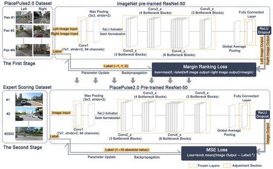 In the first stage, the model takes as input image pairs (Left–Right) from the PlacePulse 2.0 dataset, with each pair labeled by humans with relative perception preference annotations (e.g., left image preferred or right image preferred). The backbone of the model uses ResNet50 pretrained on ImageNet as the feature extractor [27]. To avoid overfitting and enhance generalization, the weights of the convolutional layers are frozen during training [54]. The extracted feature vectors are passed through fully connected layers, where ReLU activation functions are applied to introduce nonlinearity [55], thereby enhancing the model’s capability to represent complex visual features. Dropout is employed to randomly deactivate neurons, reducing overfitting and improving model robustness [56].