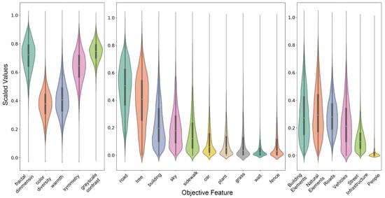 All objective feature values were normalized using MinMaxScaler from the Scikit-learn library (version 1.2.2) in Python 3.10, scaling them to a range between 0 and 1. Figure 6 presents the distribution of these features. LLVFs include fractal dimension, symmetry, grayscale contrast, color diversity, and warmth. Regarding HLSFs, we extracted 150 types of landscape elements from the semantic segmentation results. The figure shows the 10 categories with the highest average pixel proportions.