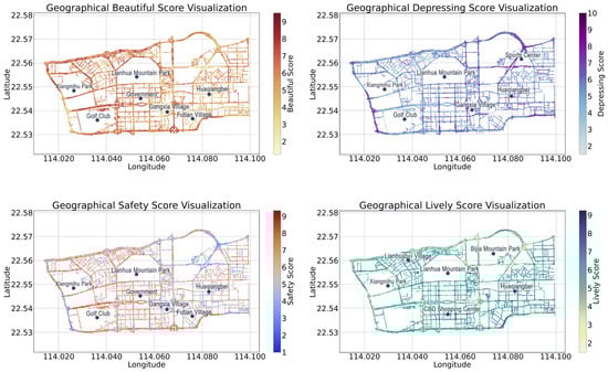 Beauty and safety reflect fundamental environmental needs, directly influencing residents’ satisfaction and willingness to live in a city [33]. Depressing dimension reflects negative emotional responses to the urban environment and is closely linked to mental health [34]. Lively dimension relates to the social interaction dimension and reflects how built environments shape social behavior patterns [35,36]. The dimensions of boring and wealthy were excluded from this study due to their indirect or ambiguous influence on perceptual experiences compared to the selected four.