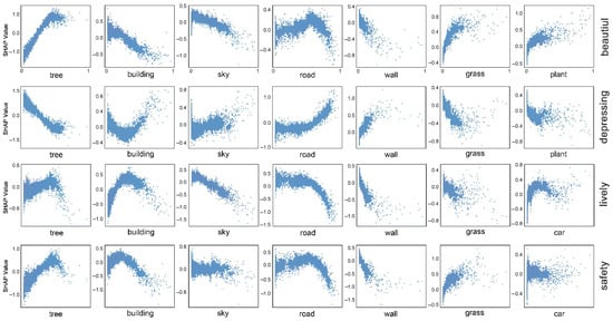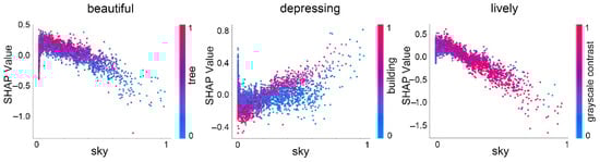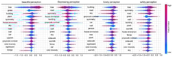 In terms of causal modeling, we reconstruct the perception prediction model using XGBoost, a widely used machine learning algorithm, to quantitatively assess the specific impact of various landscape features on perception scores. In earlier experiments, we trained a perceptual scoring model using ResNet-50. Although this deep learning model achieved high predictive accuracy, it functions as a typical black-box, offering limited interpretability. By contrast, XGBoost, which adopts an ensemble of decision trees [19], provides strong interpretability, as each decision node is based on clearly defined features. When integrated with SHAP analysis, XGBoost not only quantifies the marginal contribution of each environmental feature to the prediction outcome but also captures the complex, nonlinear interactions among features [57,58], enabling a more comprehensive understanding of how specific street view characteristics shape human perception.