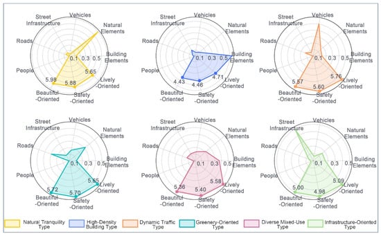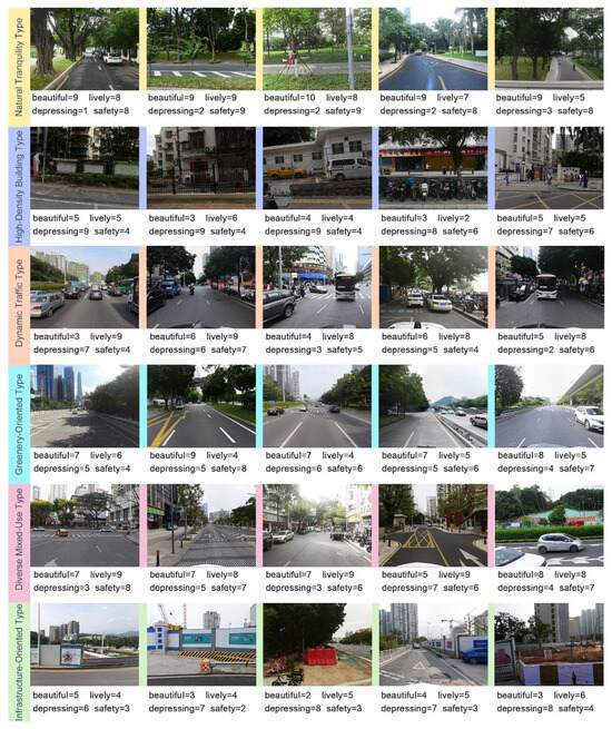 Third, to comprehensively quantify street visual features, the study evaluates both low-level and high-level elements. LLVFs include fractal dimension, symmetry, grayscale contrast, color diversity, and warmth, which capture the basic visual properties that influence first impressions. HLSFs involve 30 semantic elements that reflect functional and ecological attributes. At the compositional level, six prototypical streetscape patterns are identified—Natural Tranquility Type, High-Density Building Type, Dynamic Traffic Type, Greenery-Oriented Type, Diverse Mixed-Use Type, and Infrastructure-Oriented Type—to illustrate how element combinations affect perception holistically.