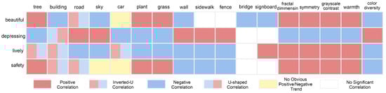 Moreover, current studies lack a systematic framework to evaluate the contributions of multi-dimensional visual features to perception outcomes. Existing literature primarily focuses on high-level semantic analysis [14,18], using semantic segmentation to classify SVIs into components such as buildings, sky, vegetation, and vehicles, then assessing the perceptual influence of each [13,19]. However, low-level visual features—such as color diversity, grayscale contrast, and fractal dimension—also play a critical role in shaping human perception of streetscapes [20,21].