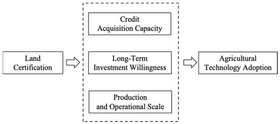 Against this backdrop, this paper draws on property rights economics and agricultural technology diffusion theories to systematically analyze the internal logic of how land certification influences agricultural technology adoption from three dimensions: the credit acquisition capacity, long-term investment willingness, and production and operational scale. The aim is to provide a theoretical foundation for deepening rural land institutional reforms and advancing the innovative application of agricultural technologies. The research mechanism is shown in Figure 1.