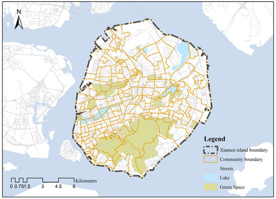 Xiamen Island, as illustrated in Figure 1, serves as the study area for this research. Designated as one of China’s special economic zones during the 1980s reform era, Xiamen has undergone rapid urbanization, transforming from a modest coastal settlement into a vibrant, compact, and modern city in southeastern China. Xiamen Island functions as the political, economic, and cultural core of Xiamen City, characterized by diverse urban forms and functions. These attributes make it an exemplary setting for investigating the impacts of street configuration on urban vibrancy.