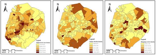 Urban vibrancy is inherently multidimensional, encompassing patterns of spatial activity, human presence, and socio-economic engagement [,,]. To capture its complexity, we primarily follow the approach of Huang et al. [] by constructing three complementary indicators: the density of life service reviews, the density of social media check-ins, and the density of mobile device users. These indicators were then individually normalized using min–max normalization. Each indicator captures a unique facet of urban vibrancy, from routine consumer activity and social interaction to real-time population dynamics, which reflect collective urban experience. By integrating these indicators, we can achieve an impartial and comprehensive representation of vibrancy across different urban contexts.