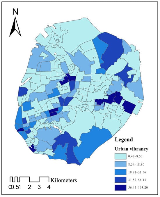We apply the entropy-weighting approach, which assigns objective weights based on the internal variability of each indicator [], to develop the comprehensive vibrancy index. This approach is selected for its capacity to objectively reflect the informational contribution of each indicator without introducing subjective bias. Given that our study integrates multiple dimensions of the socioeconomic activity, it is crucial to maintain the full set of input variables without dimensionality reduction or prior assumptions. Compared with expert-based weighting or principal component analysis, the entropy-weighting method ensures data-driven weight assignment while preserving the multidimensional nature of the urban vibrancy. Therefore, it can capture the complexity of urban vibrancy. It is worth mentioning that highly correlated indicators may violate the independence assumption of entropy-weighting method. However, since the indicators we chose actually reflect the different aspects of people’s activities, the method is applicable in this study.
