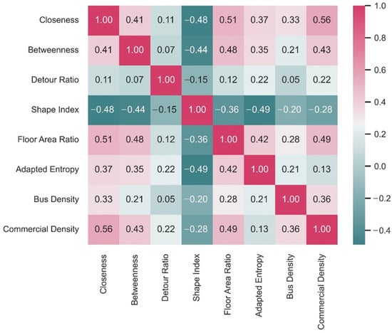 To examine potential multicollinearity among built environment variables, a Pearson correlation analysis is performed. Figure 4 displays the resulting correlation matrix. It shows weak correlations (absolute Pearson coefficients < 0.3) for most variable pairs and moderate correlations (0.3–0.7) for a few, indicating minimal multicollinearity and supporting robust model interpretation.