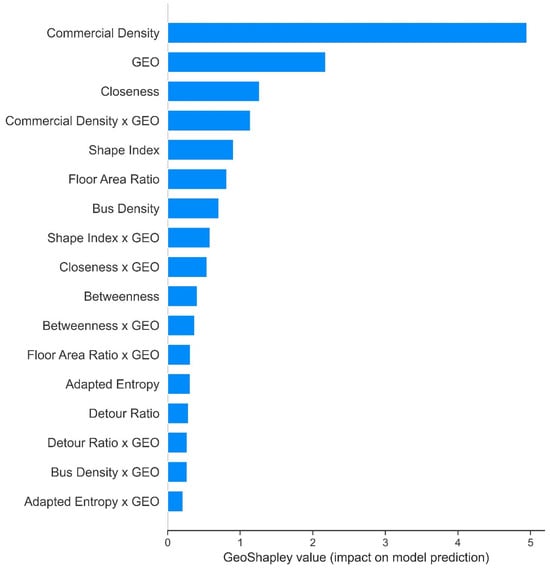 A RF model is developed to predict urban vibrancy using built environment variables as inputs. Table 3 summarizes the model’s performance, with the training set slightly outperforming the testing set. The GeoShapley method is applied to interpret the model, revealing the global, local, and spatial effects of built environment variables on urban vibrancy. Figure 5 illustrates the global contributions of location, built environment variables, and their interactions to urban vibrancy (for summary statistics, please refer to Table A1 in Appendix A). Variables positioned closer to the top of the chart indicate greater relative importance in shaping the model’s predictions of urban vibrancy.