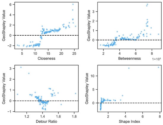 GeoShapley is an explainable artificial intelligence method designed for geospatial data analysis. It extends the game-theoretic Shapley value framework to quantify the contributions of both location and non-spatial features to model predictions. This method conceptualizes location attributes (e.g., coordinates) as a joint player in the cooperative game of prediction, alongside other features such as built environment variables. This enables GeoShapley to simultaneously capture nonlinear relationships and spatially heterogeneous effects within machine learning models []. This makes it particularly suitable for urban studies where spatially heterogeneous effects are pervasive. Moreover, GeoShapley not only reveals the global effects of built environment variables on urban vibrancy but also provides localized explanations at the community level. Such spatially resolved interpretations help uncover how variations in street configuration affect urban vibrancy across different areas, thereby offering valuable insights for localized urban planning and decision making.