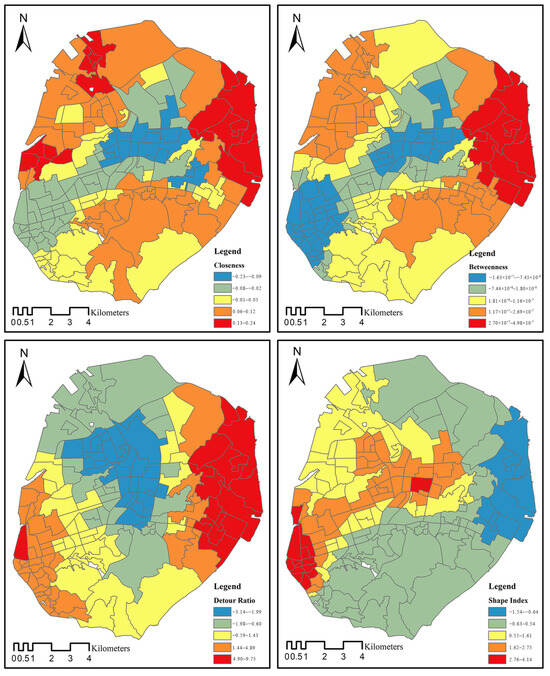 Street configuration is typically represented by street network centrality metrics [,]. In this study, we employ closeness centrality and betweenness centrality. Closeness measures how easily a location can reach all other nodes in the network, with higher values indicating better spatial accessibility. Betweenness, on the other hand, captures how frequently a location lies on the shortest paths between other nodes, highlighting its role as a connector or bridge within the urban fabric. To enrich the representation, two supplementary indicators, i.e., the detour ratio and the shape index, are included to provide a more comprehensive depiction. The detour ratio measures the ratio of the actual travel path length to the straight-line distance between two locations; higher values suggest a more circuitous and less efficient street network. The shape index quantifies the compactness of a spatial unit, with values closer to 1 indicating more circular and compact forms, while higher values reflect more elongated or irregular shapes. These indicators are computed using sDNA (spatial design network analysis) within an 800 m analytical radius which reflects typical daily walking distances. Angular distance is adopted as the routing and analysis metric.