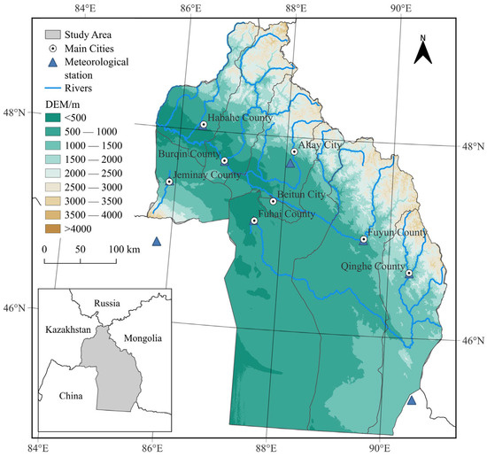 Altay Prefecture (45°00′–49°10′ N, 85°31′–91°04′ E) is located at the junction of China, Kazakhstan, Russia, and Mongolia, situated on the southwestern slope of the central Altay Mountains and the northern edge of the Junggar Basin. Covering a substantial area of 1.18 × 105 km2, the prefecture accounts for approximately 7.1% of Xinjiang’s total landmass in China. Administratively, it comprises six counties and two cities, namely Altay City, Beitun City, Burqin County, Habahe County, Jeminay County, Fuhai County, Fuyun County, and Qinghe County (Figure 1). The area experiences a temperate continental cold climate, characterized by low precipitation, high evaporation, and ample sunlight. The average annual precipitation ranges from 131 to 223 mm, while the annual evaporation rate is between 1367 and 2066 mm. The annual average total water resources in Altay Prefecture are 10.18 × 109 m3, making it one of the water-rich areas in Xinjiang, China. Its hydrology is dominated by three major river systems: the Irtysh River and the Ulungur River, both originating from the Altai Mountains, and the Jeminay Mountain Stream, which originates from the Saur Mountains. These three river systems collectively drain an area of 9.57 × 104 km2.