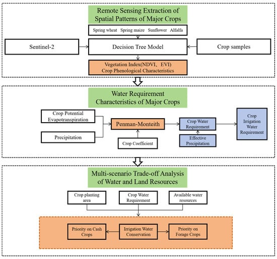 This research framework consists of three main components: first, extracting the spatial distribution of major crops using Sentinel-2 remote sensing data and a decision tree model; second, calculating crop water requirements and irrigation needs based on the Penman-Monteith model; and finally, analyzing different land and water resource allocation scenarios through multi-scenario simulations to assess the trade-offs between crop cultivation and water resource use, providing support for the optimized management of agricultural water resources (Figure 2).