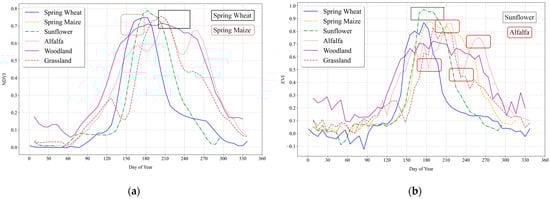 Vegetation index change curves of major crops in Altay Prefecture. (a) NDVI time-series curves of major land-cover types. (b) EVI time-series curves of major land-cover types.