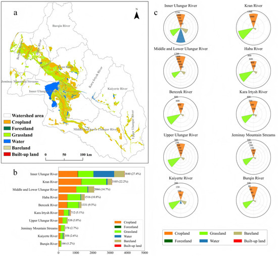 Spatial patterns of oasis land cover in Altay Prefecture in 2023. (a) Spatial distribution of land cover in oasis. (b) Distribution by basins in oasis. (c) Land-cover structure by basins in oasis.