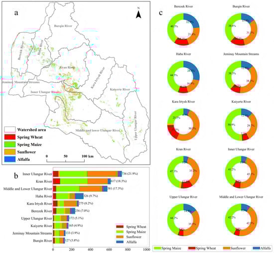 As shown in Figure 5a, the planting areas of major crops in Altay Prefecture in 2023 were sunflower (1241 km2), spring maize (1410 km2), spring wheat (377 km2), and alfalfa (340 km2), collectively occupying 3368 km2 and representing 78.17% of the total cropland. Extracting the planting areas of these major crops helps reveal the cropping structure and spatial distribution of oasis agriculture. According to Figure 5b, the major crops were mainly distributed in the middle and lower reaches of the Ulungur River, its internal basin, and the Kran River basin. Figure 5c indicates that the highest proportions of sunflower cultivation were observed in the Kara Irtysh River basin, the internal basin of the Ulungur River, and its middle and lower reaches. In other basins, spring maize was the dominant crop. Higher proportions of spring wheat cultivation were found in the Kara Irtysh, Berezek, and Burqin River basins, while alfalfa was more commonly planted in the Haba and Berezek River basins (Figure 5).