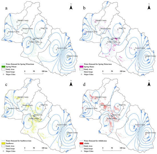 The average water requirement during the growth period of crops in the oasis of Altay Prefecture. (a) Long-term average crop water requirement for spring wheat. (b) Long-term average crop water requirement for spring maize. (c) Long-term average crop water requirement for sunflower. (d) Long-term average crop water requirement for alfalfa.