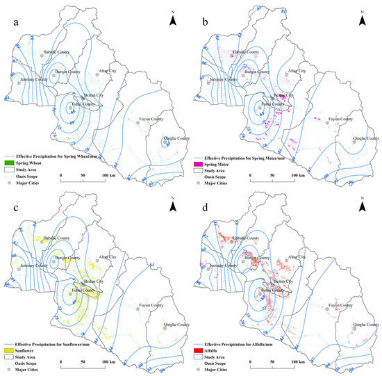 The average effective precipitation during the growth period of crops in the oasis of Altay Prefecture. (a) Long-term average effective precipitation for spring wheat. (b) Long-term average effective precipitation for spring maize. (c) Long-term average effective precipitation for sunflower. (d) Long-term average effective precipitation for alfalfa.