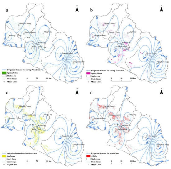 The average irrigation water requirement during the growth period of crops in the oasis of Altay Prefecture. (a) Long-term average irrigation water requirement for spring wheat. (b) Long-term average irrigation water requirement for spring maize. (c) Long-term average irrigation water requirement for sunflower. (d) Long-term average irrigation water requirement for alfalfa.