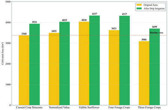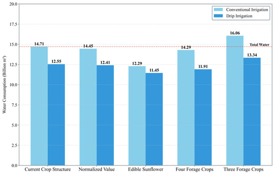 The Altay oasis, located at the heart of the transnational ecological conservation zone shared by China, Kazakhstan, Russia, and Mongolia, is a region with tremendous potential for water resource utilization. However, with the continued expansion of agriculture, its ecological vulnerability has become increasingly pronounced. Within this fragile balance lies a critical opportunity: efficient water resource management could pave the way for sustainable development across the entire arid oasis regions. This study uses a decision tree model based on a feature threshold to map the spatial distribution of major crops in the Altay Prefecture oasis, assess their water requirements, and identify the coupling relationships between agricultural water and land resources. Furthermore, it proposed optimization planting structure strategies under three scenarios: water-saving irrigation, cash crop orientation, and forage crop orientation. In 2023, the total planting area of major crops in Altay Prefecture was 3368 km2, including spring wheat, spring maize, sunflower, and alfalfa, which consumed 2.68 × 109 m3 of water. Although this area accounted for only 2.85% of the land, it consumed 26.23% of regional water resources, with agricultural water use comprising as much as 82.5% of total consumption, highlighting inefficient agricultural water use as a critical barrier to sustainable agricultural development. Micro-irrigation technologies demonstrate significant water-saving potential. The adoption of such technologies could reduce water consumption by 14.5%, thereby significantly enhancing agricultural water-use efficiency. Cropping structure optimization analysis indicates that sunflower-based planting patterns offer notable water-saving benefits. Increasing the area of sunflower cultivation by one unit can unlock a water-saving potential of 25.91%. Forage crop combinations excluding soybean can increase livestock production by 30.2% under the same level of water consumption, demonstrating their superior effectiveness for livestock system expansion. This study provides valuable insights for achieving sustainable agricultural development in arid regions under different development scenarios.