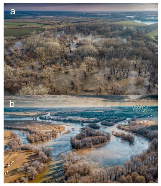 Figure 2. Reconstruction of the unregulated Hármas-Körös River floodplain at the time of the spring flood in the 18th century. (a) The image endeavors to convey the strip of forest serving as a breaker for the unregulated river and the free flow of the accretion waters. (b) Reconstruction was performed with the help of a photograph taken by a drone near the village Öcsöd and with the prompt mentioned in the text.