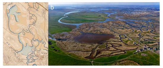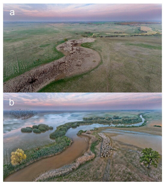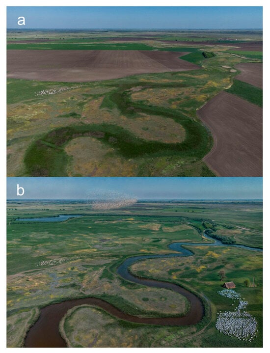 Figure 3. Királyhegyes pasture in the Middle Ages. In the image, we used generative filling to replace modern arable fields with grasslands and marshes, and replaced the filled-in, dry riverbed with a river, in accordance with medieval archival documents. (a) Original drone photo from May 2024; (b) AI-generated image.