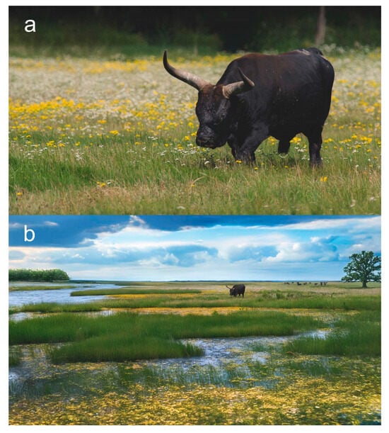 Figure 4. Group of aurochs (Bos primigenius) in the Great Hungarian Plain. The original image of a Heck cattle was magnified several times using generative filling. (a) Original image from the Hortobágy National Park; (b) AI-generated landscape.