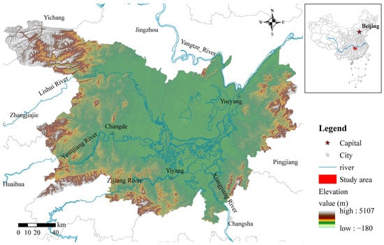 The Dongting Lake region (28°10′–30°10′ N, 111°30′–113°50′ E) is located in the north-central part of Hunan Province, China. It serves as both a wetland ecosystem of international importance and a key ecological barrier in the Yangtze River Basin. The study area encompasses the administrative territories of Yueyang, Yiyang, and Changde, with a total area of approximately 37,267 km2 (Figure 1). The region is centered around Dongting Lake, featuring a dense river network fed by major tributaries such as the Xiangjiang, Zishui, Yuanjiang, and Lishui Rivers.