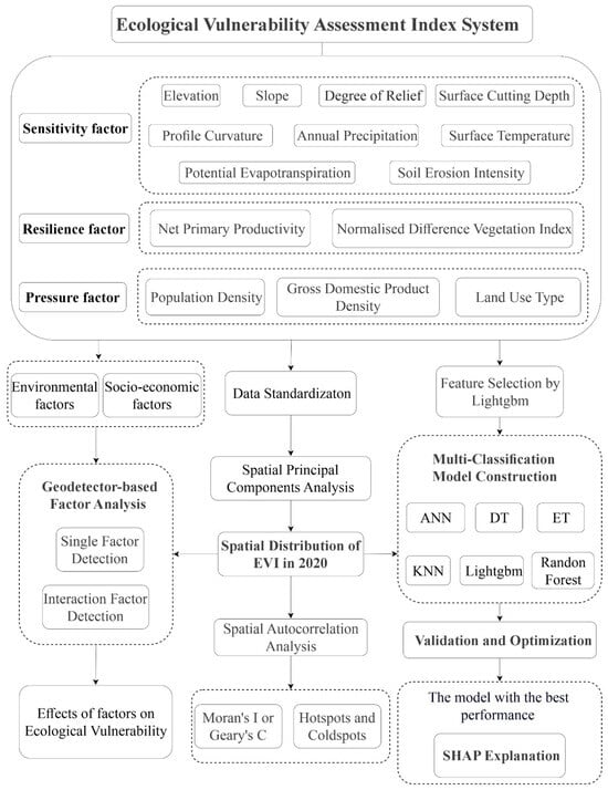 This study consisted of four main steps. First, an evaluation indicator system was constructed based on the Sensitivity–Resilience–Pressure (SRP) framework by selecting 14 indicators representing natural environmental and socioeconomic factors. Second, Spatial Principal Component Analysis (SPCA) was applied to reduce dimensionality, retaining principal components that, together, explained over 85% of the total variance. These components were used to calculate the Ecological Vulnerability Index (EVI) based on their respective weights. Subsequently, global and local spatial autocorrelation of EVI was analyzed using Moran’s I to identify spatial clustering patterns.