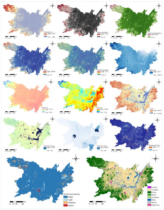 The selection of evaluation indicators is a complex process. In this study, an ecological vulnerability assessment system was developed based on the SRP model, with consideration of the ecological and environmental characteristics of the Dongting Lake region. The indicator selection followed the principles of scientific validity, comprehensiveness, representativeness, and the integration of qualitative and quantitative approaches, aiming to holistically reflect the regional ecological conditions [32,33]. A total of 14 indicators were selected under two broad categories—natural environment and socioeconomic factors—encompassing terrain, land ecology, climate, and human activity. The indicators and their spatial distribution are shown in Table 1 and Figure 3.